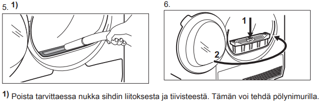 Kunkin kuivausohjelman lopussa nukkasihdin symboli tulee näyttöön ja sinun on puhdistettava suodatin. Puhdista sihti aina kuivausrummun käytön jälkeen.