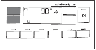 Perusannostuksen asettamiseksi kosketa säiliöpainikkeita, kunnes pesuaineen oletusannostelumäärä ja kaksi nuolta ilmestyvät näytön alareunaan. Kosketa Temp . -painiketta toistuvasti säätääksesi annostusta ylöspäin ja Spin- painiketta säätääksesi sitä alaspäin. Vähimmäismäärä on 1 ml.