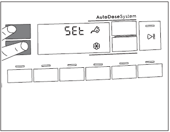 Päästäksesi asetustilaan pidä painettuna Temp. ja Spin- painikkeita samanaikaisesti 3 sekunnin ajan, kunnes näytössä näkyy SET näytön vasemmalla puolella ja pesuaine- ja huuhteluaineastian merkkivalot vilkkuvat näytön oikealla puolella.