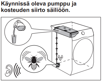 - Ensimmäisten kuivausohjelmien aikana voit kuulla voimakkaampia ääniä, jotka aiheutuvat pumpusta, kosteusanturista tai tiivisteestä, joiden pitää kostua hieman vedellä.