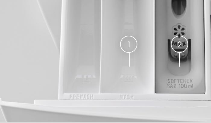 Lisää nestemäistä pesuainetta oikeaan lokeroon (1) ja vettä hylkivä aine kankaanpehmennyslokeroon (2) lisätäksesi tai palauttaaksesi veden hylkivän pinnan vaatteen viimeisessä huuhtelussa. Vältä jauhepesuaineiden, huuhteluaineiden tai valkaisuaineiden käyttöä.